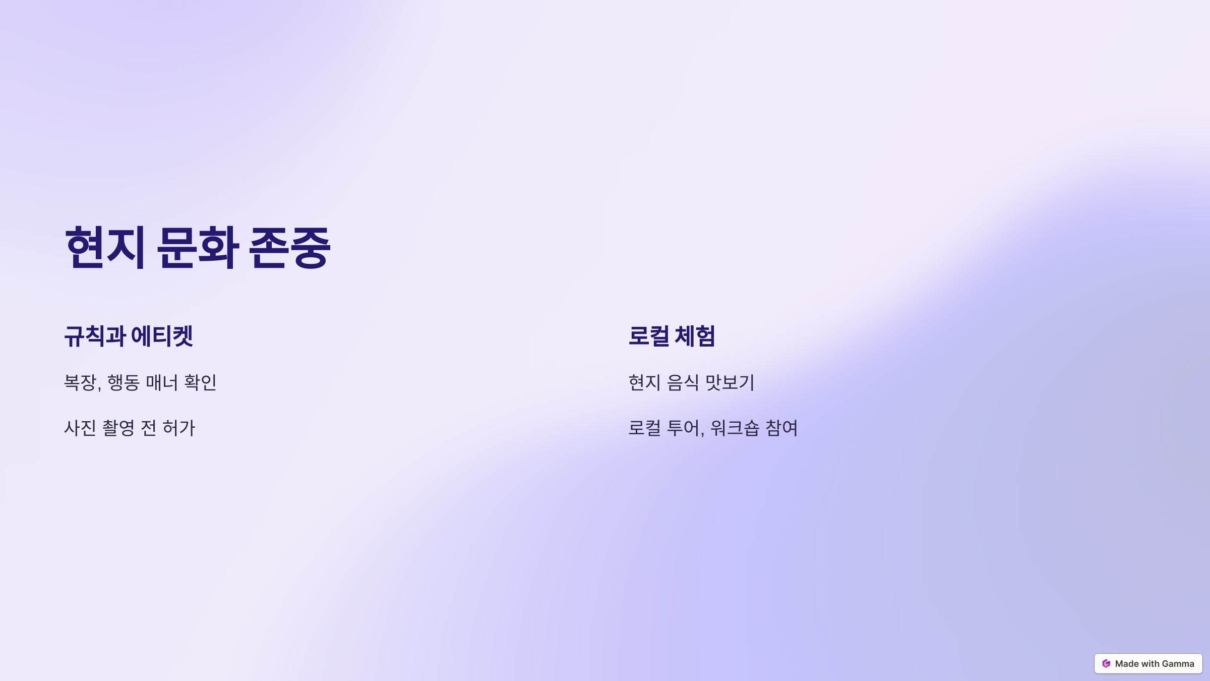 - 복장, 행동 등 현지에서 기대되는 매너를 확인하세요.