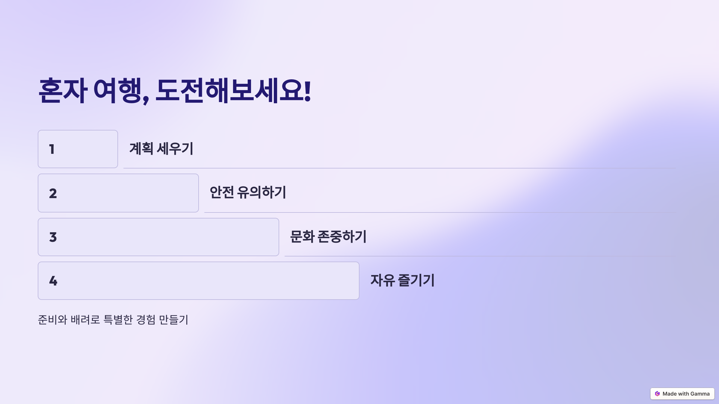 혼자 여행은 준비와 안전에 대한 배려만 있다면 누구나 즐길 수 있는 특별한 경험이 됩니다. 철저한 계획과 현지 문화를 존중하는 태도로 여행을 준비하세요. 그리고 무엇보다 자신만의 시간을 마음껏 즐기는 것을 잊지 마세요. 혼자 떠나는 여행, 여러분도 도전해 보세요! 🌍✈️