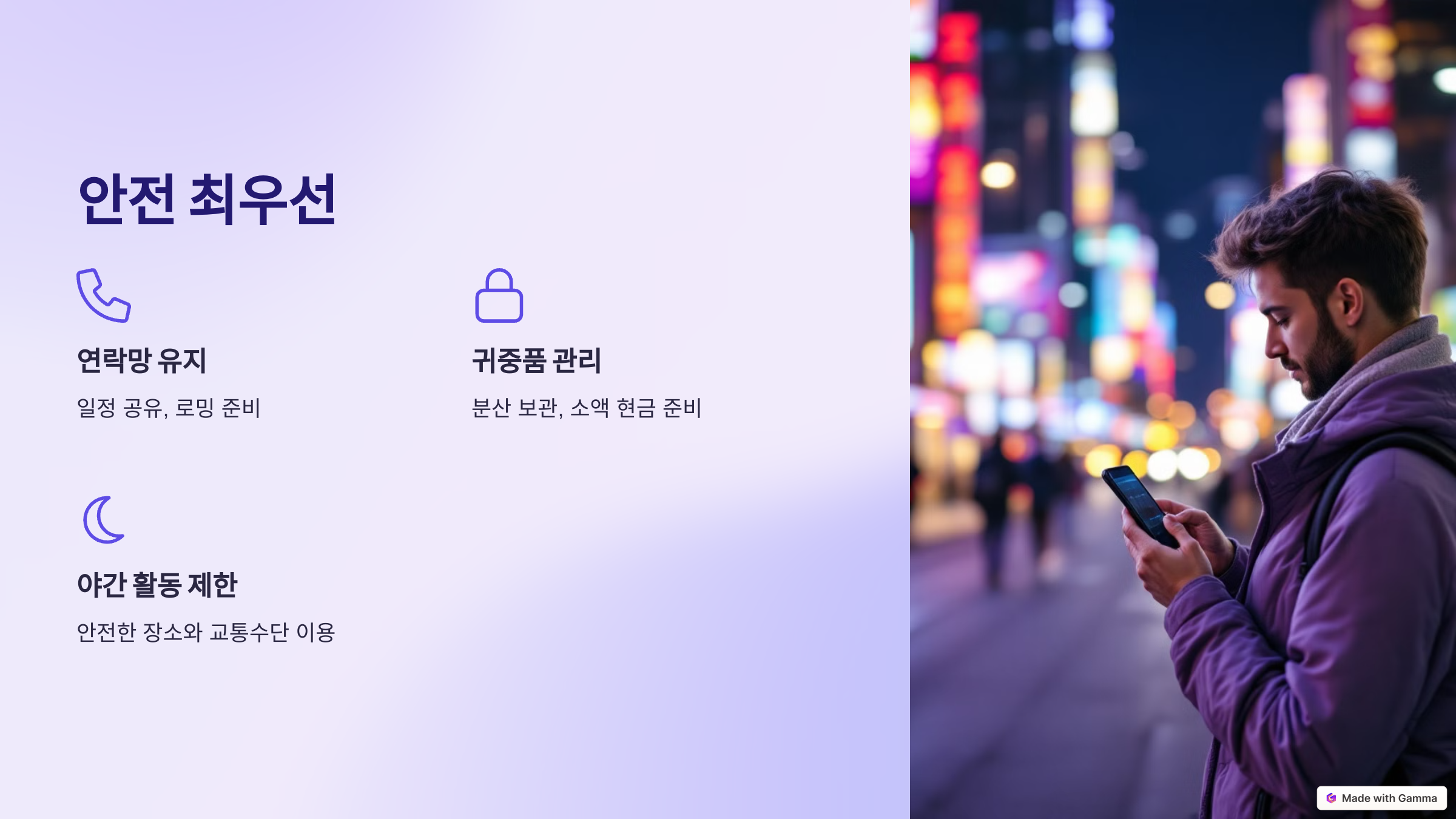 - 저녁 시간 이후 이동 시, 신뢰할 수 있는 교통수단을 이용하세요.